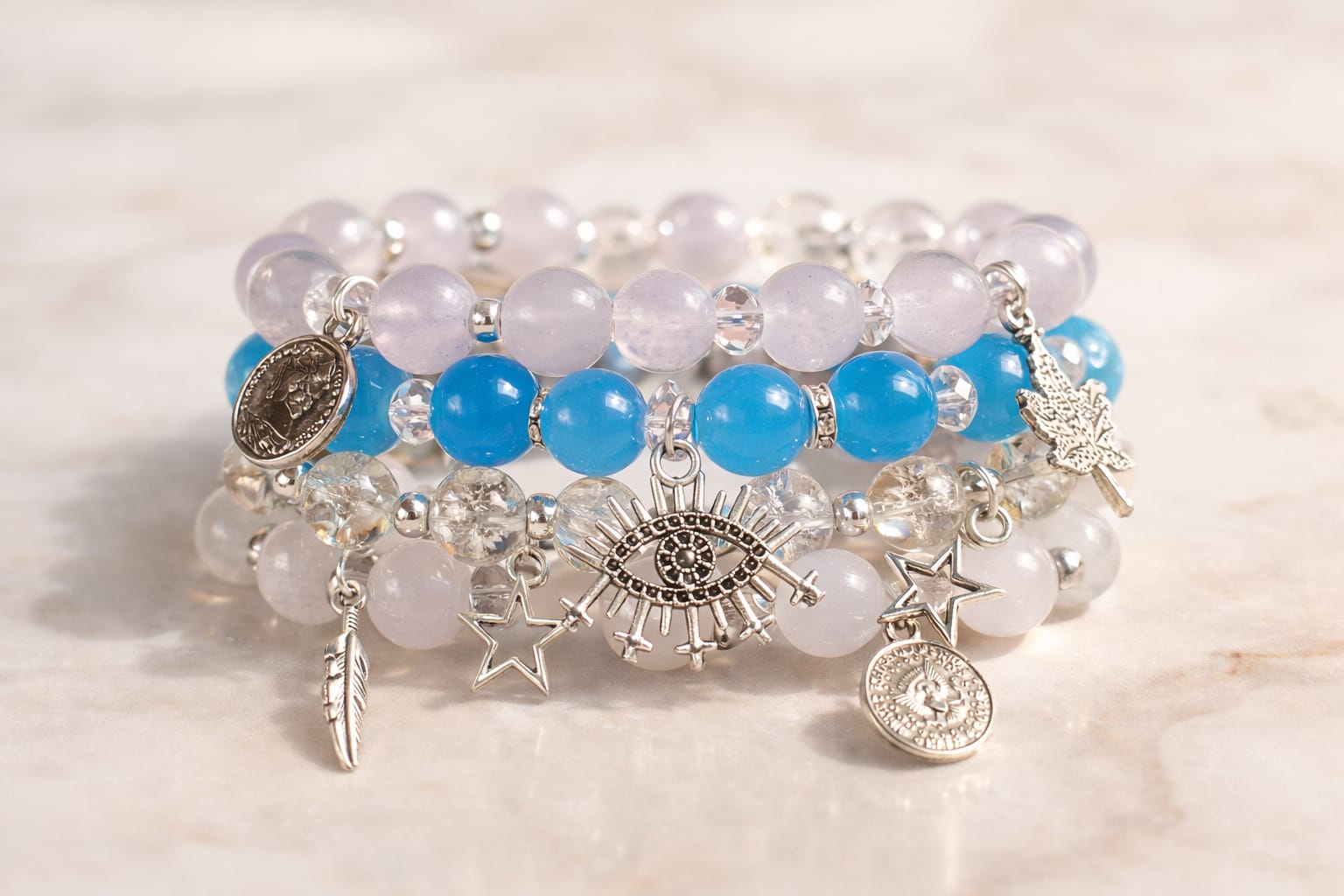 Carrying a protective and serene vibe, this beautiful evil eye bracelet stack is a thoughtful gift for someone who loves meaningful jewellery with a calm, elevated aesthetics.
