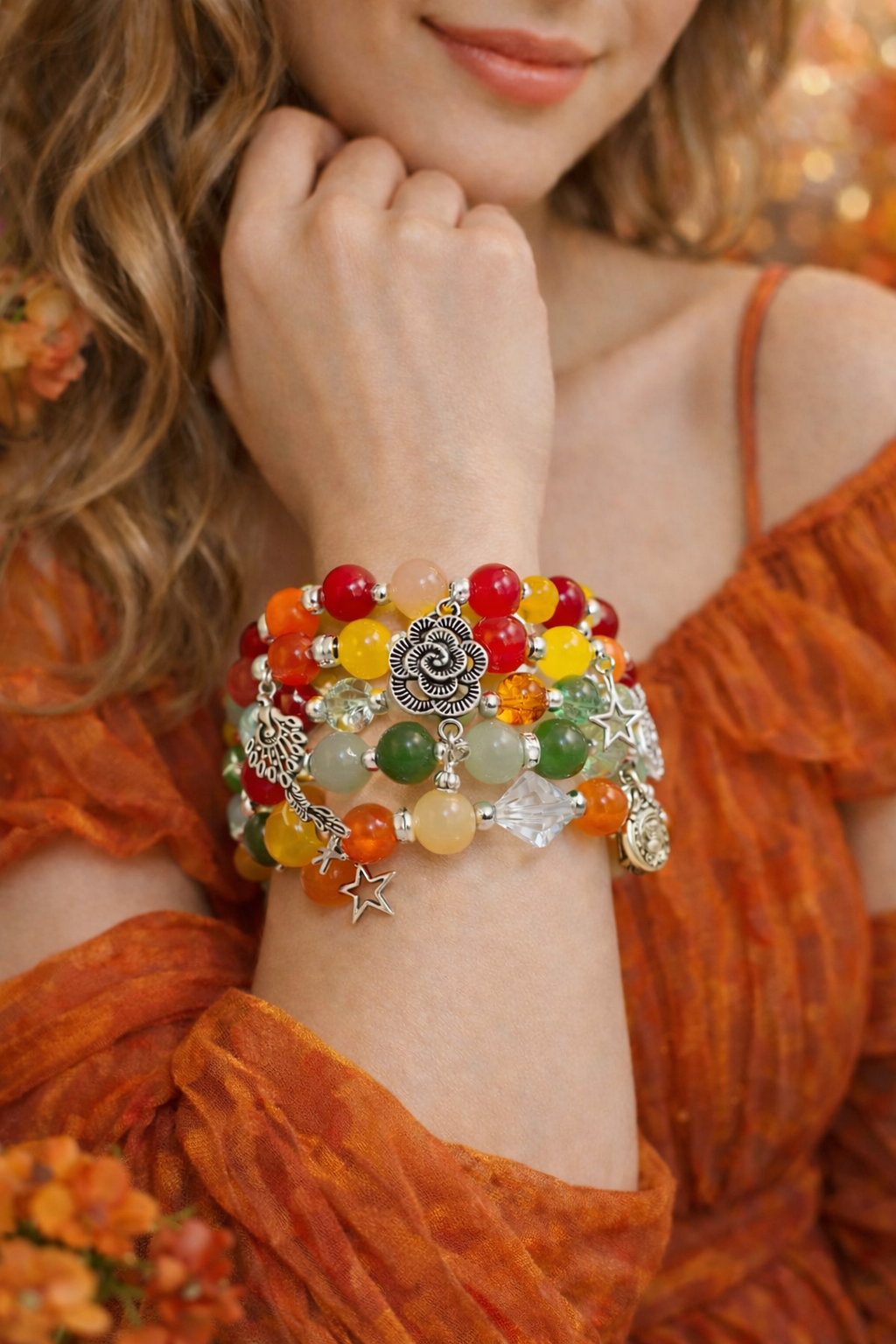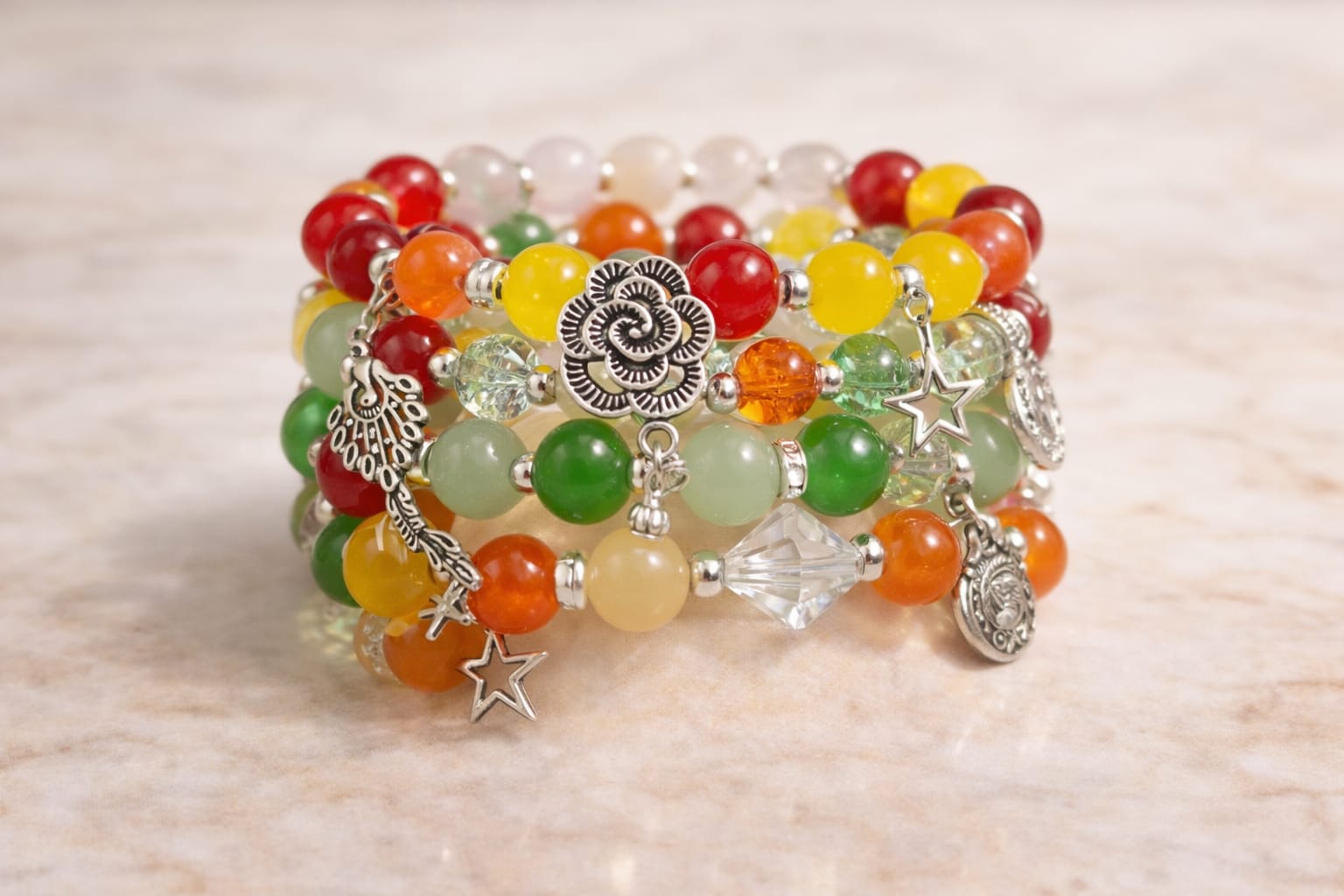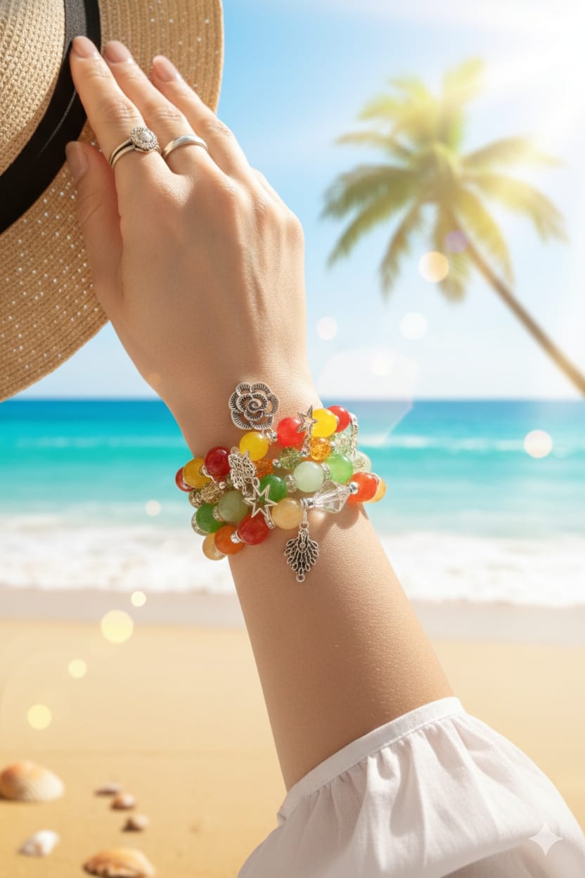 Carrying a bold, festive, cheerful and positive vibe, this colorful charm bracelet stack is a thoughtful gift for someone who loves bright colors or nature-inspired jewellery.