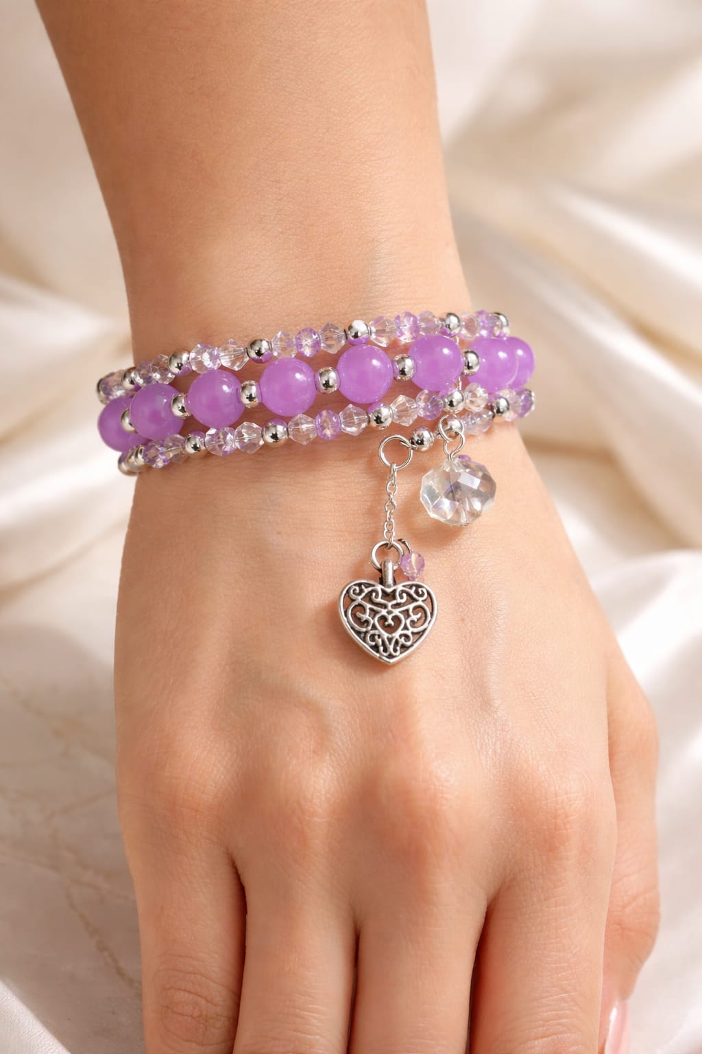 Finished with two delicate dangling charms – a detailed silver heart and a clear crystal glass bead, it feels like a winter fairytale wrapped around your wrist.