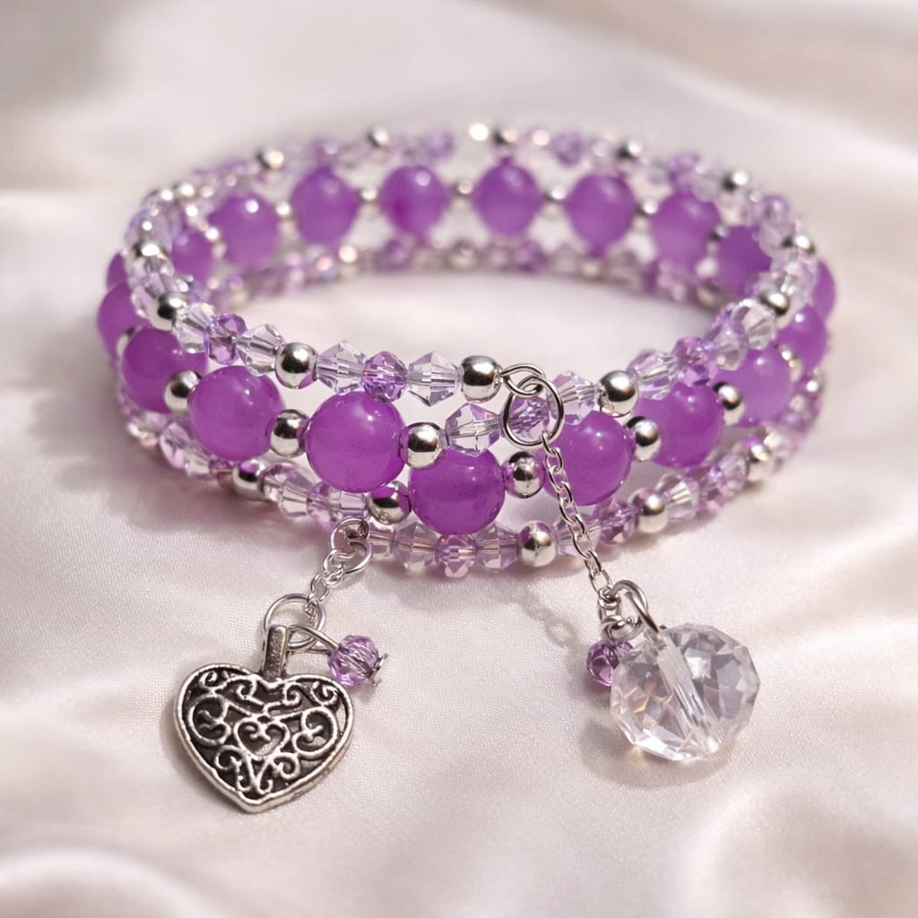 Carrying a soft, frosted and romantic vibe, this beautiful purple beaded bracelet reminds you of walking through a quiet lavender field wrapped in morning frost, sipping hot cocoa by the window in a cozy sweater as the sky turns lilac at dusk, delicate petals dusted with ice crystals under silver light, and a soft kiss in the quiet hush of falling snow.