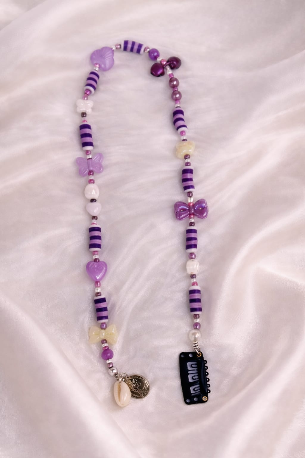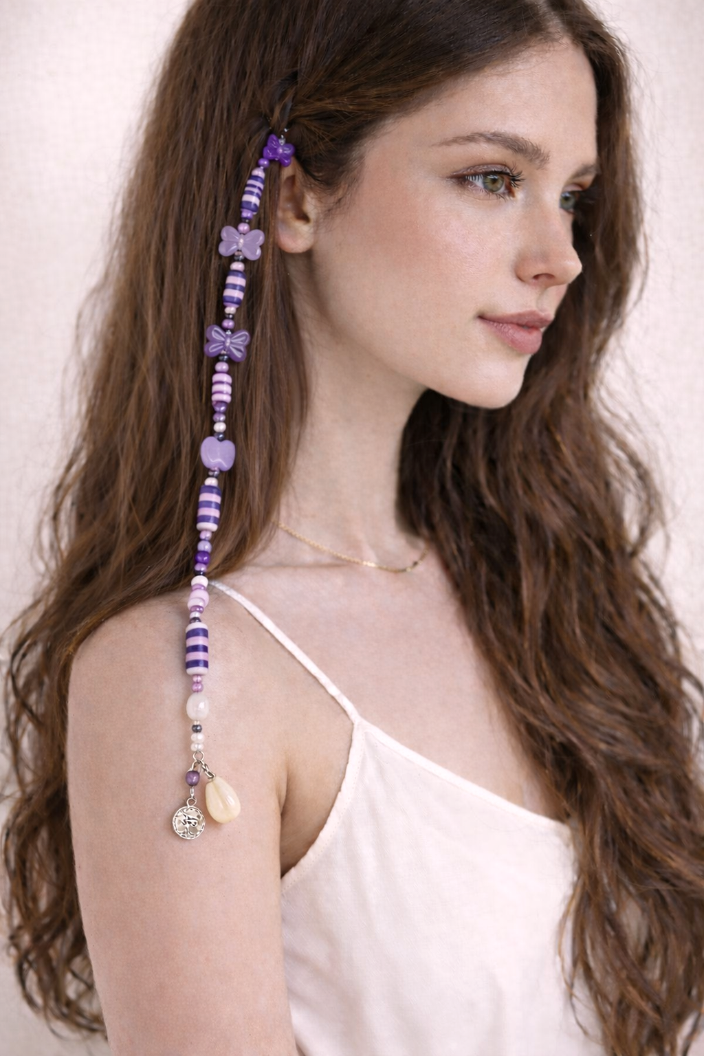 With its violet and lavender striped beads, delicate bow and heart, floral accents and luminous pearl details, this purple hair extension adds a graceful pop of color to any hairstyle.