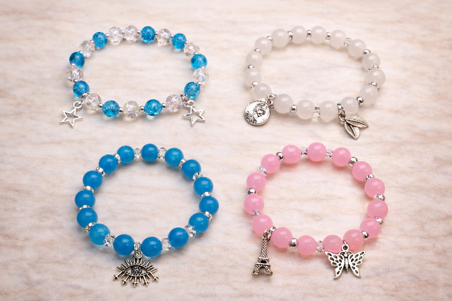 Handcrafted Blue Pink Stack Bracelet – Set of Four – Inspired by the Dreamworld of Cotton-Candy Skies, Floating Clouds, and Delicate Fairy Wings Dancing at Twilight.