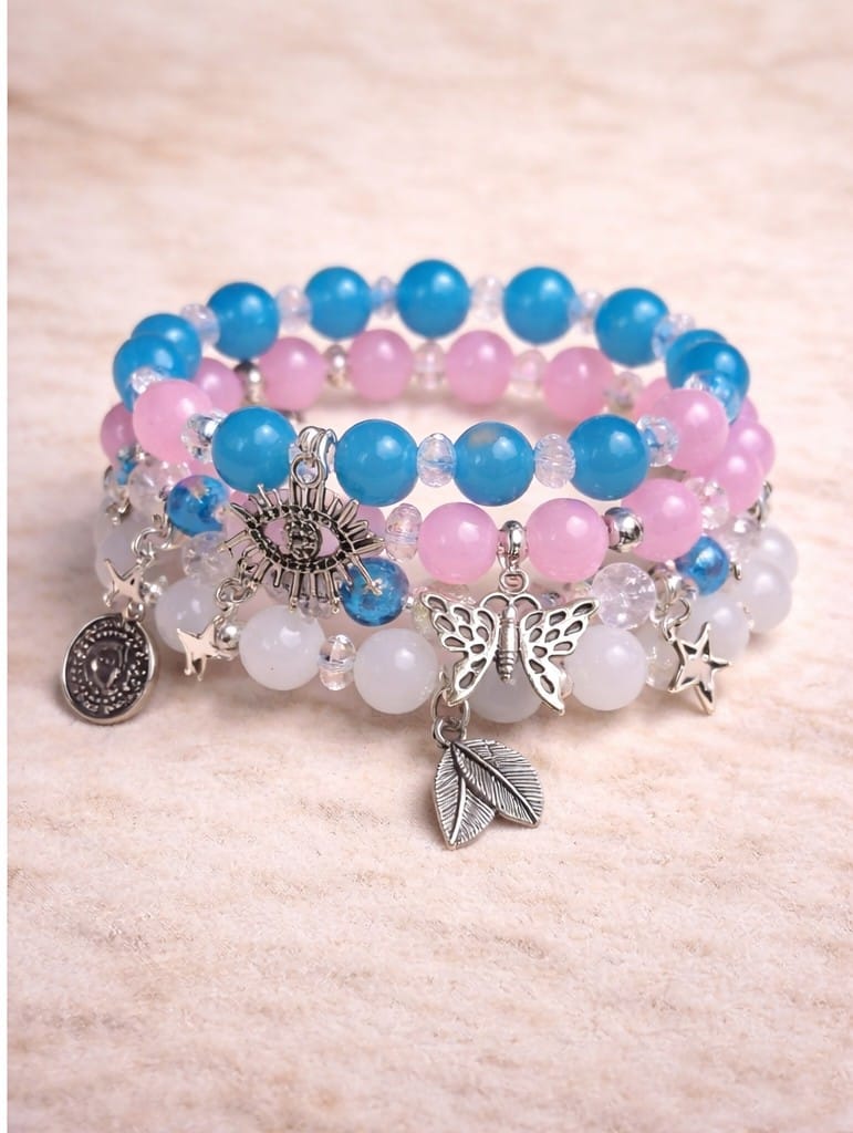 Carrying a soft and gentle vibe, this beautiful blue pink stack bracelet is a thoughtful gift for someone who loves embracing her feminine, free-spirited side.