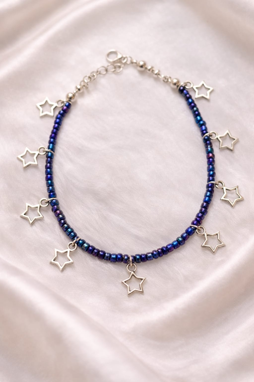 Handcrafted Blue Anklet With Silver Stars – Inspired by Celestial Dreams, Moonlit Shores and Starry Nights at the Beach.