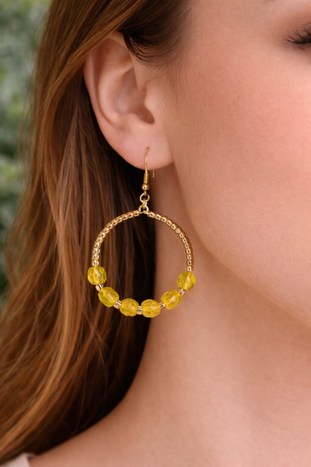 Crafted with luminous yellow glass beads in a rich honeyed hue, these summer-inspired hoops shimmer like liquid sunlight. The golden beads wrap the frame in a soft metallic glow, creating a beautiful harmony between warmth and brilliance.