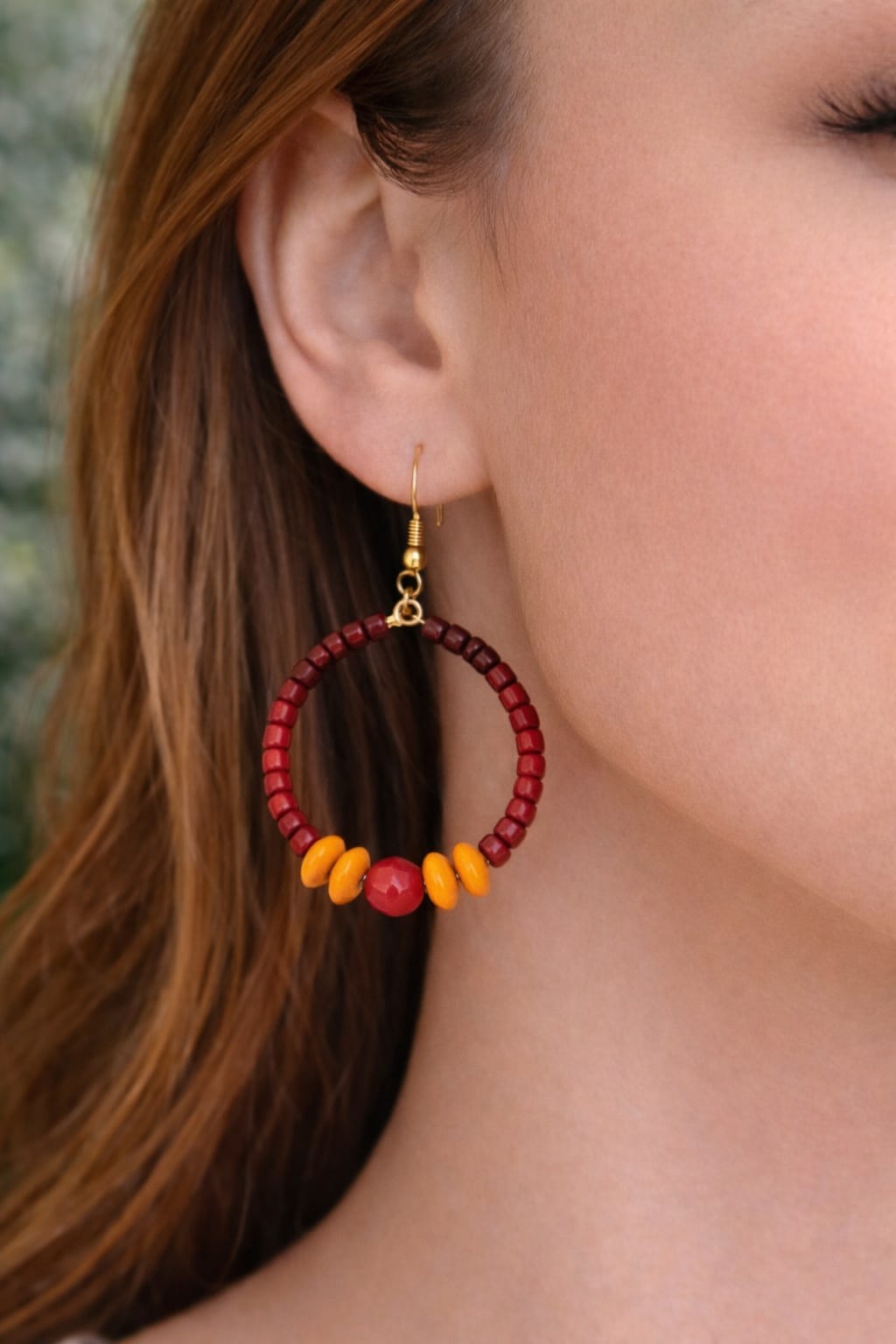 Carefully arranged along a delicate hoop, and finished with elegant gold fish hook ear wires, these terracotta hoop earrings create a look that feels both grounded and luminous. Rustic yet refined, they evoke a feeling of being wrapped in a soft autumn shawl while walking trough falling leaves.