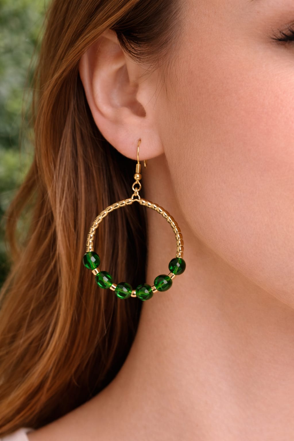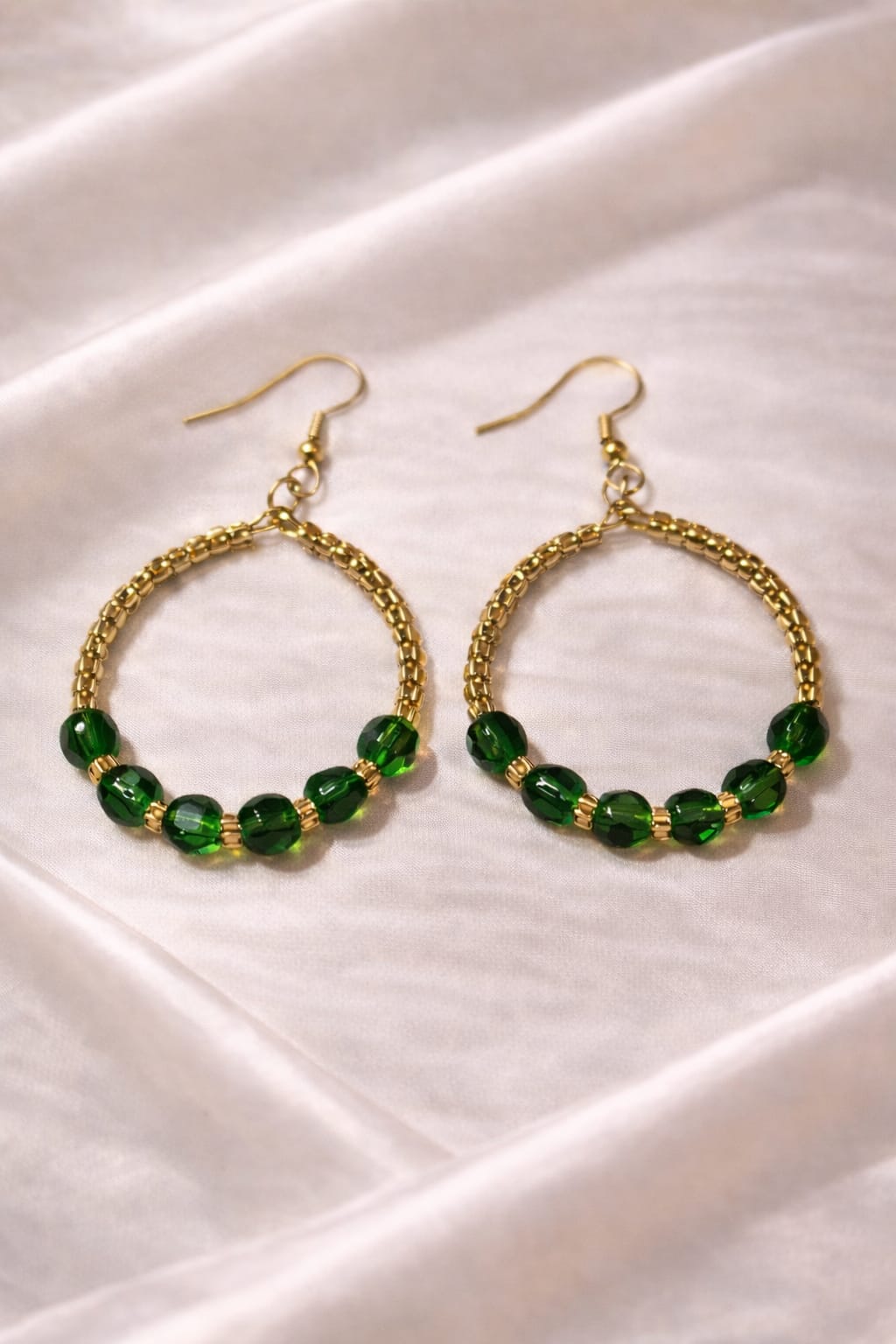 Crafted with luminous emerald green and golden glass beads, these nature-inspired hoops capture the richness of emerald forests kissed by the molten sunlight, creating a beautiful harmony between regal and organic.
